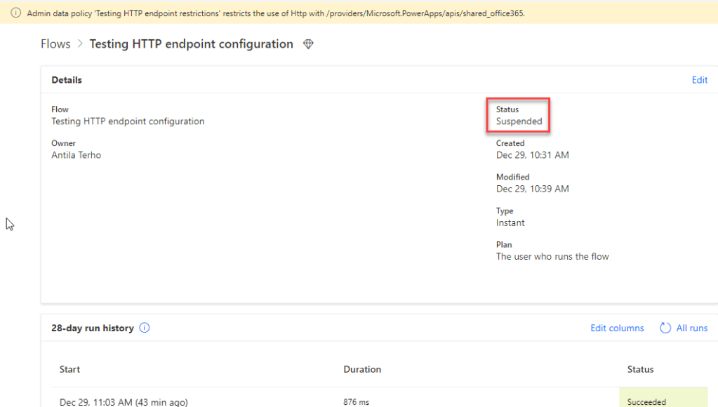 However, I am still able to start the flow and it is successfully run. This is due to the delay in how DLP policies are applied. After a certain time (took about 30 minutes) the flow is correctly suspended as it violates the policy: