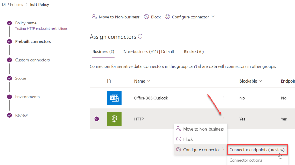 Before jumping into our company Default environment and modifying its DLP policy straight away, I want to try out this endpoint configuration feature first.