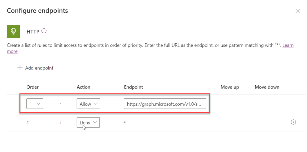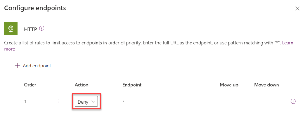 However, some of the flow using currently HTTP connector are currently in active production use and we can’t make this desired configuration change until the flows are moved over to another more permissive environment. Therefore we have decided to let the flows running in the default environment, but instead configure the HTTP connector endpoints so that only specific endpoints are allowed.
