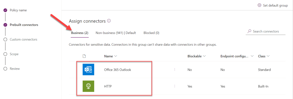Step #2: Create DLP policy that has both connectors in Business category